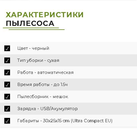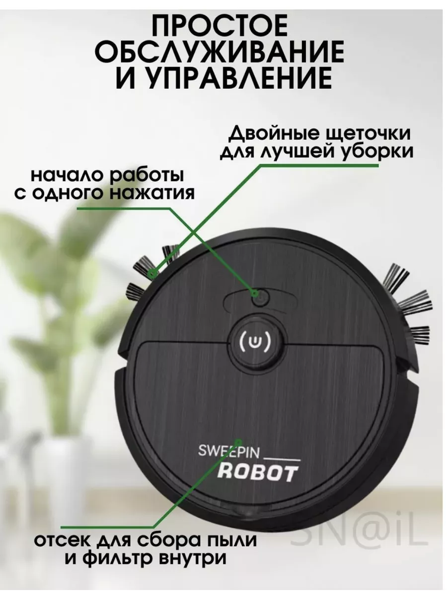 Мини робот-пылесос — компактное и удобное устройство для ежедневной уборки. Подходит для всех типов пола: плитки, ковров и ламината. Благодаря небольшому размеру легко проникает в труднодоступные места